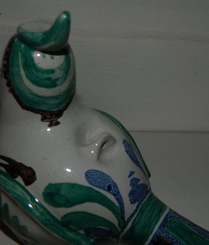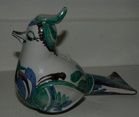 Figur i fajance af fugl. Dekoreret i tre farver. Ikke signeret, men den er med sikkerhed designet af Bjørn Wiinblad. Fremstår i perfekt stand. Figuren kan stå men er ligevel beregnet til at hænge - øsken på ryggen til ophæng. 13½ cm høj og 19½ cm lang. HOVEDET DREJER TIL HØJRE.