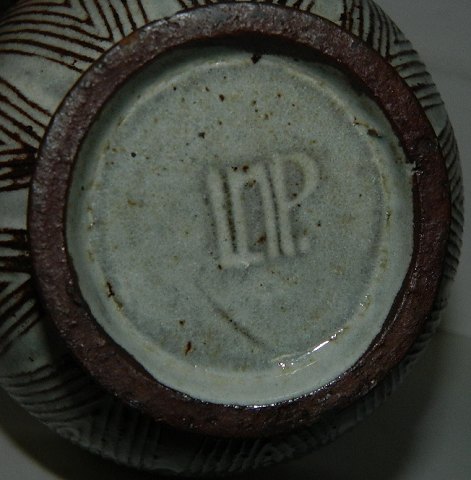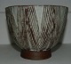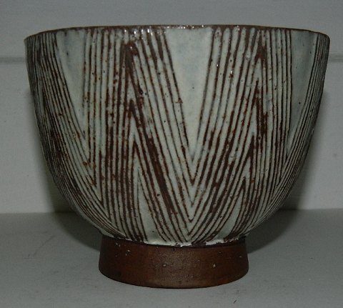 Skål i keramik. Grå glasur. Ribbet dekoration rund om skålen. Udført af Lisbeth Munch-Petersen (1909-97). Fremstillet på LMP´s værksted i Gudhjem på Bornholm midt i 20. århundrede. Fremstår i perfekt stand. Signeret af kunstneren på bunden. 9½ cm høj.