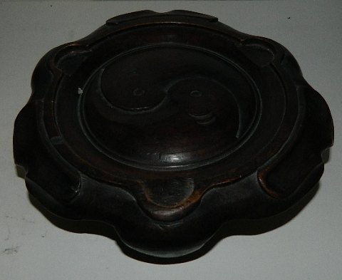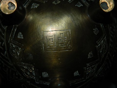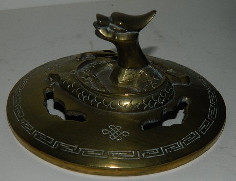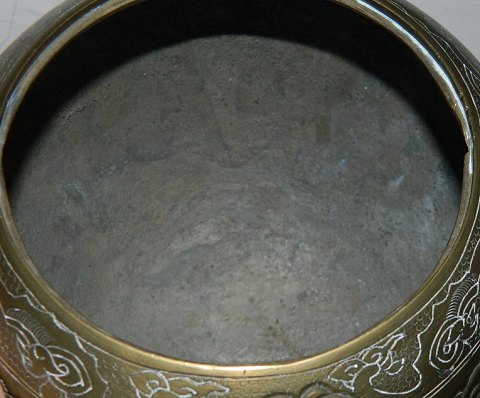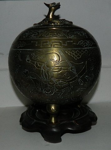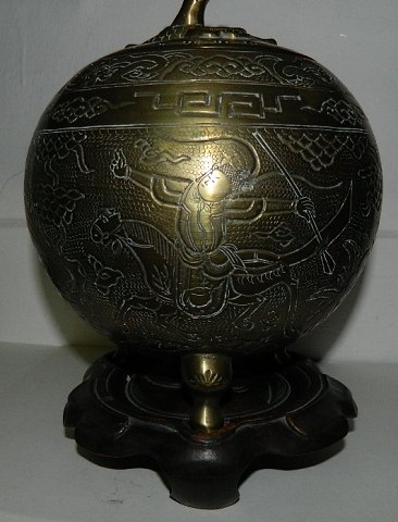 Skål i bronze på tre fødder. Stående på base af træ. Dekoreret med mænd til hest på siden. Signeret på bunden. Fremstillet Kina i begyndelsen af 20. århundrede. Fremstår i god stand uden skader eller reparationer. 23½ cm høj på basen. 20 cm høj uden.