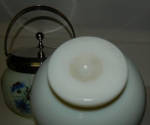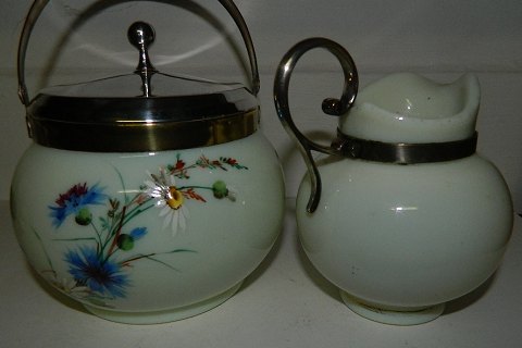 Metalbesat sukkerskål og flødekande i opalineglas. Dekoreret med blomster. I perfekt stand. Fremstillet omkring 1900 i Frankrig. Almindeligt brugsslid på metallet. Sukkerskålen er 12½ cm høj incl. lågknop.