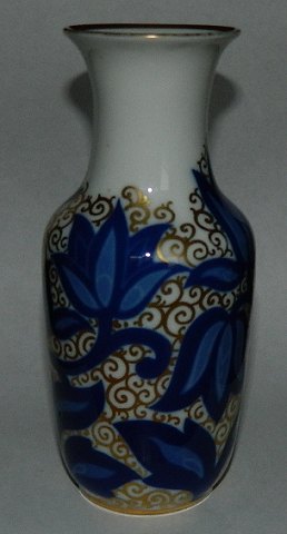 Vase i porcelæn fra Rosenthal, Tyskland ca. 1920. Jugend dekoration i blåt og guld. I perfekt stand. Fabriksmærket på bunden. 14½ cm høj.