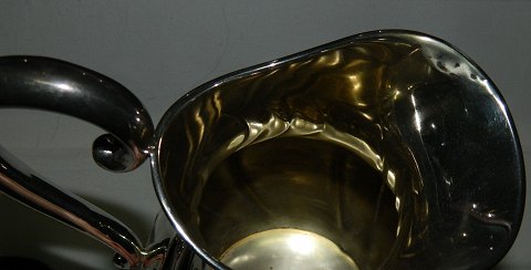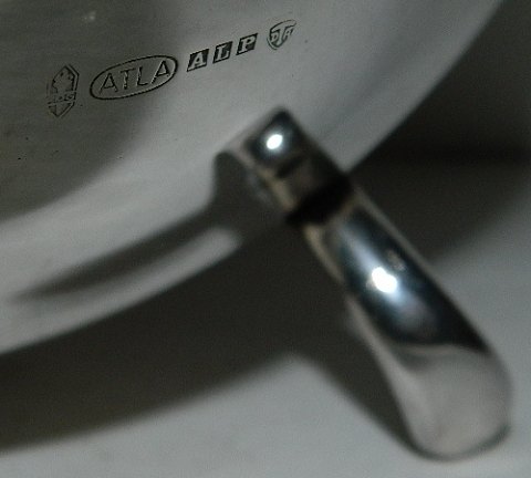 Stor kande i sølvplet på tre fødder. Fremstår i god stand. Overfladen uden brugsslid. Muligvis en mindre reparation på kanten til venstre for hældetuden (se foto). 23½ cm høj.