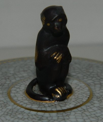 Skål med låg fra Royal Copenhagen. Skålen dækket af rødkrakeleret glasur. Gråt låg med figur af abe som lågknop. I perfekt stand. 1. sortering. 7½ cm høj. Fabriksmærket på bunden.