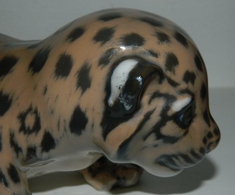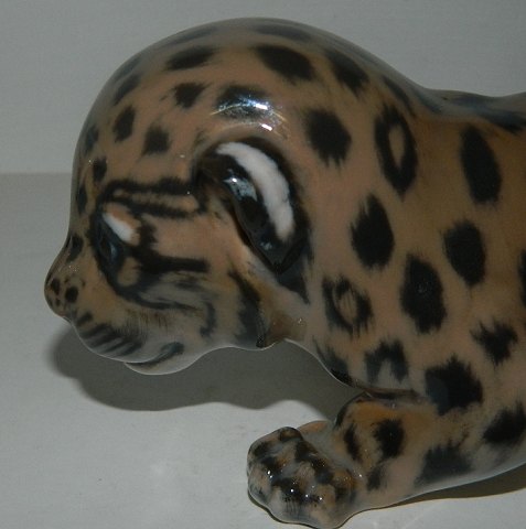 Figur i porcelæn af jaguar unge. Udført af billedhugger Jeanne Grut (f. 1927). Fremstår i god stand. 1. sortering. Har dog glasurfejl ved begge ører. Ubekendt navn anført under fabriksmærket. 8 cm høj og 22 cm lang.