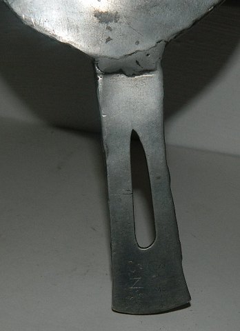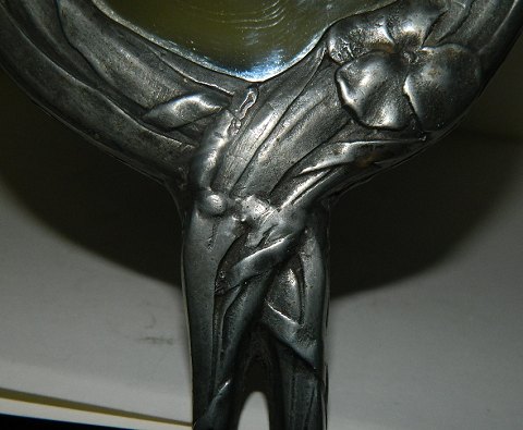 Håndspejl i tin udført af Mogens Ballin (1871-1914). Skønvirkedekoration. Har været knækket ved overgangen mellem spejl og håndtag. Gammel reparation. Fabriksmærket på bagsiden.