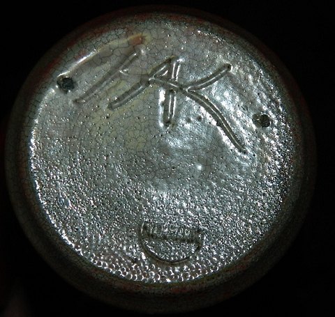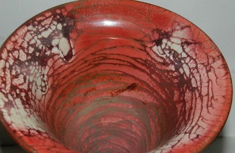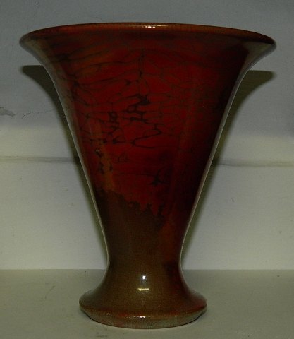 Trompetformet vase i keramik fra Kähler-fabrikken i Næstved. Ca. 1920. Dækket af en rød lustre-glasur, herunder naturligt krakeleret. I perfekt stand. Fabriksmærket på bunden med HAK DENMARK. 17½ cm høj.