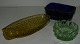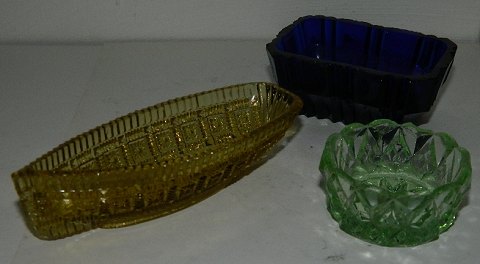 Tre gamle pressede saltkar i farvet glas. Det gul/brune bådformede koster 300,00. Det grønne kr. 225,00. Det blå saltkar er reserveret.