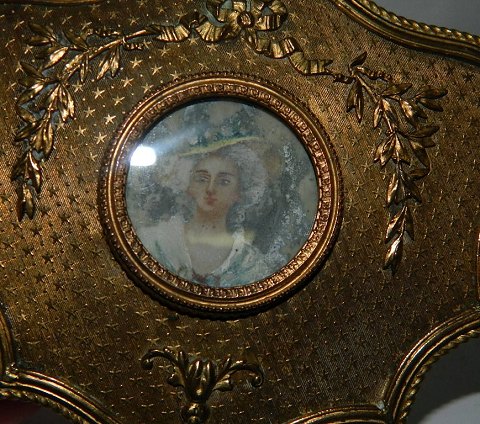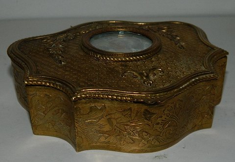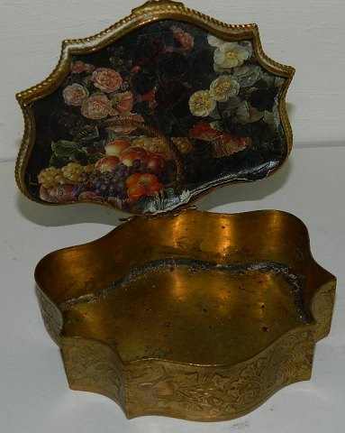 Fransk dåse i metal. Dekoreret med malet portræt af kvinde med hat bag glas. I god stand uden skader. Påstemplet "FRANCE" på bagsiden. 4½ cm høj - 11½ cm lang og 10½ cm bred.