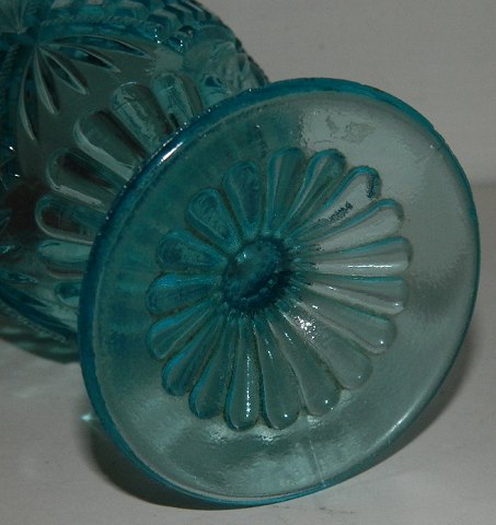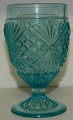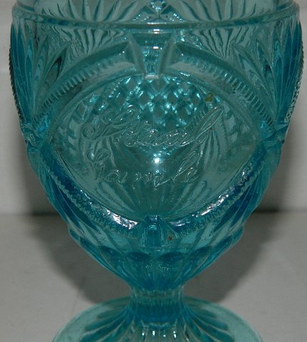 Blåt presset glas med teksten "Skaal Gamle"