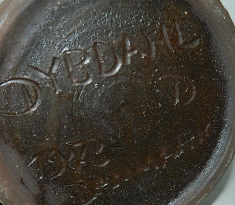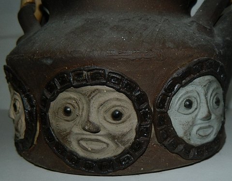 Tepotte i keramik med hank af bambus. Dekoreret med hovedet. Fremstillet hos Dybdal værksted i Danmark i 1972. Signeret af ubekendt kunstner. Fremstår i perfekt stand. 19 cm høj.