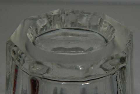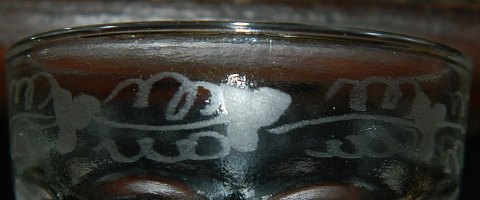 Børneglas i klart presset glas fra Fyens Glasværk fra ca. 1920. I perfekt stand uden skader eller reparationer. Usædvanlig vinbladsslibning på kanten. Seks stk. haves. 6 cm høje.