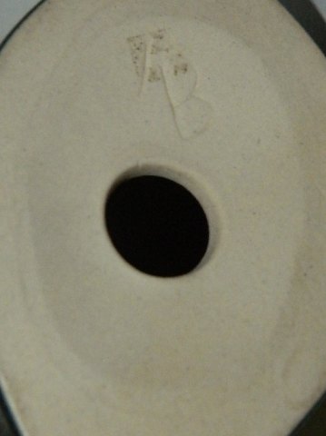 Figur i keramik af siddende kat i keramik. Dækket af en mørk blå glasur. Skabt af Knud Basse (1916-1991), der havde sit værksted på Bornholm. Figuren er i perfekt stand. Signeret af kunstneren på bunden med KB. 19 cm høj.