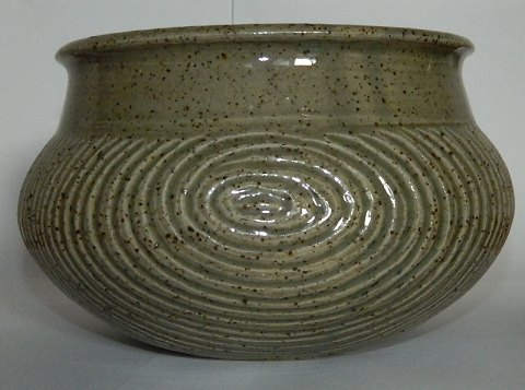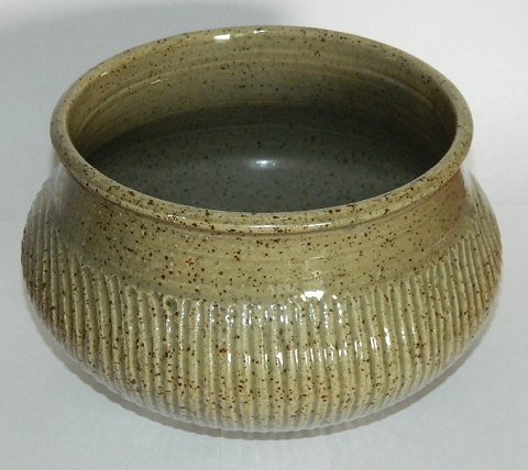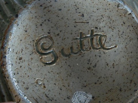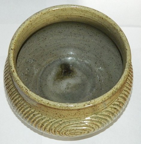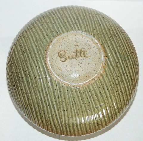 Krukke i stentøj/chamotte-ler af den danske pottemager Gutte Eriksen (1918-1908). Dekoreret med indridset mønster - Grøn glasur indenvendigt som udenvendigt. Fremstår i perfekt stand. Signeret af kunstneret på bunden. 14 cm høj - 22 cm i diameter (midt på krukken) samt indenvendigt åbingsdiameter på 17 cm