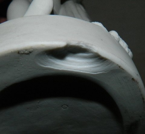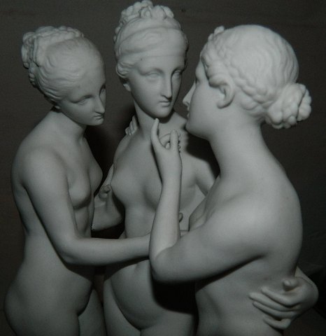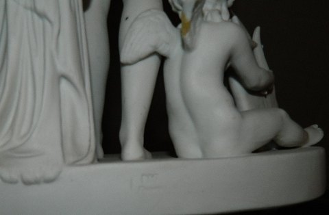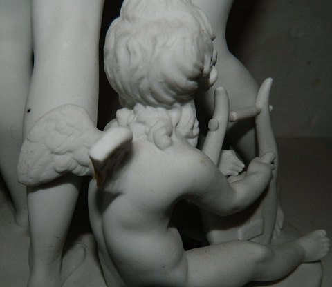 Figur fra Bing & Grøndahl i bisquit . Udført mellem 1854 og 1900. Bertel Thorvaldsen (1770-1844) skabte originalen i Rom 1817-18. Denne figur bærer titlen: "Gratierne og Amor spillende på lyre". Kopi af O. H. B. Olrik i 1854 for Bing & Grøndahl. Figuren af Amor, siddende på soklen, har knækket nogle fingre på venstre hånd ligesom højre vinge er knækket af og ligeledes bortkommet. Skår på undersiden af soklen. Indstemplet fabriksmærket B&G på bagsiden af soklen. Figuren er 33½ cm høj.