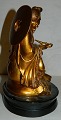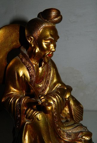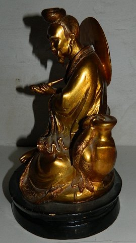 Figur af siddende kinesisk mand fra begyndelsen af 20. århundrede i Kina. Guldbemalet. I god stand uden skader. Soklen er bemalet sort. 26½ cm høj. Soklen er 16½ cm i diameter.