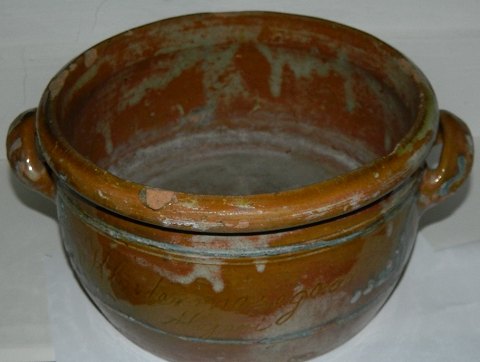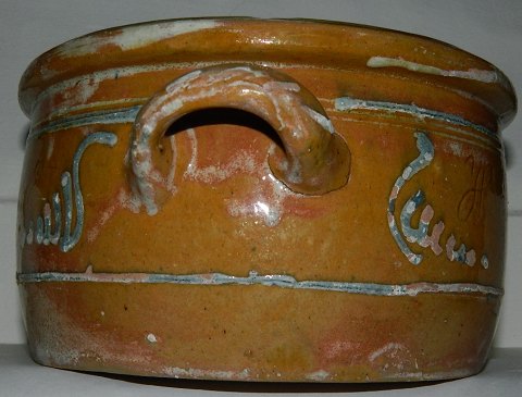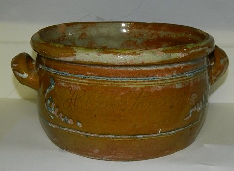 Stor smørkrukke i bemalet lertøj fra slutningen af 19. århundrede. Fremstillet for Klostermosegaard Mejeri der blev oprettet i 1887 ved Helsingør. På forsiden indridset "Klostermosegaard". På bagsiden indridset "H. Carstensen". I god stand med almindeligt brugsslid både indenvendigt og udenvendigt. Mål: 13 cm høj. Bundens diameter er 20 cm. Fra øre til øre 28 cm.