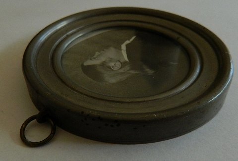 Oval ramme i tin af Mogens Ballin. I perfekt stand. Ingen skader eller reparationer. Stemplet MB samt modelnummer T60.. Fremstillet omkring år 1900. Mål: 8 cm i diameter.