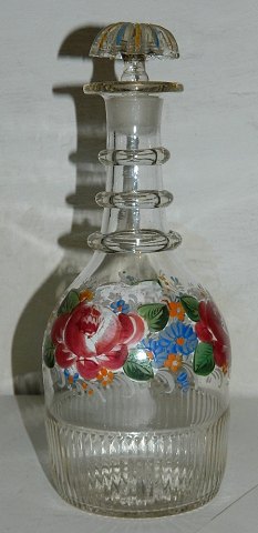 Karaffel i glas med rosenmaling fra Holmegaard Glasværk 19. århundrede. Produceres ikke efter 1874. Om korpus blomsterfrise påbrændt i emaljefarver. Prop staferet i samme farver. Fremstår i perfekt stand. Ingen skader eller reparationer. Ingen glassyge. 28 cm høj.