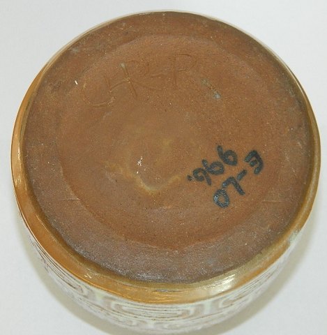 Vase i keramik med svag blålig glasur. Udført af Christian Poulsen (1911-1991) på eget værksted. Dekoreret med geometrisk mønster rundt om vasen. Fremstår i perfekt stand. Kunstnersignatur CHR. P. samt modelnummer på bunden. 11 cm høj og 12½ cm i diameter.