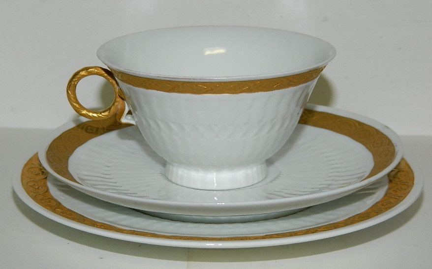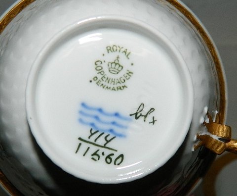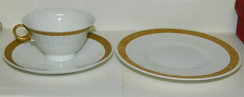 Royal Copenhagen porcelæn kop i Guld Vifte model nr. 414/11560. Sæt: Kop og underkop koster i alt kr. 285,- (eet sæt haves) Kgl. kagetallerken - 15½ cm - i Guld Vifte model nummer 414/11522 koster kr. 150,- pr. stk. (6 stk. haves). Ingen skader eller reparationer på disse dele. Alle 1. sortering.