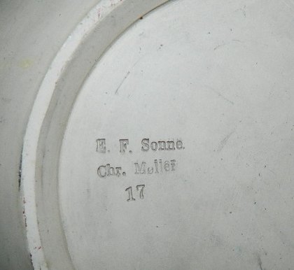 Vandkaraffel i teracotta med prop. Fremstår i god stand bortset fra mindre skår ved åbningen. Fabriksmærket fra Bornholm med E. F. Sonne samt Chr. Møller og model nummer 17. Karaflen er 27½ cm høj. Fra slutningen af 19. århundrede.