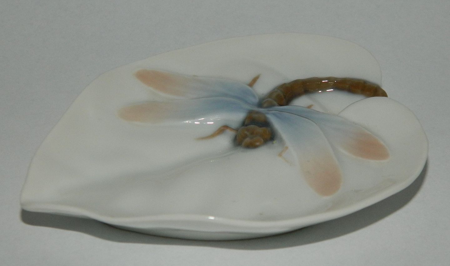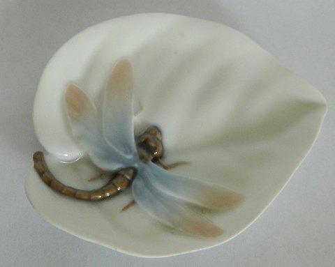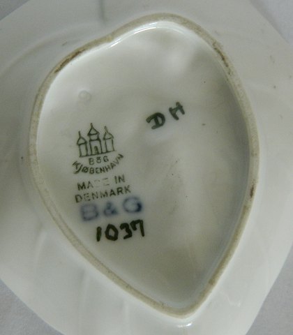 Skønvirkestil: Lille bladformet skål i porcelæn med dekoration af guldsmed fra Bing & Grøndahl fra ca. 1920. Fremstår i god stand uden skader eller reparationer. Fabriksmærket på bagsiden. 1½ cm høj og 9½ cm lang.