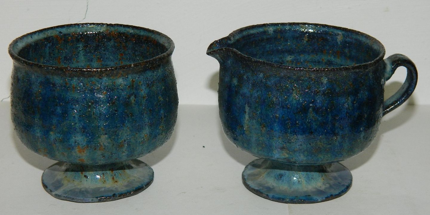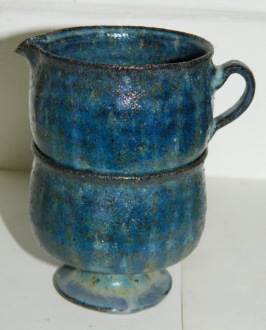 Sukker -og flødesæt på fod i keramik af Gutte Eriksen. Blåt glaseret. Fremstår i perfekt stand. Flødekanden er 7 cm høj. Begge dele signeret på bunden af kunstneren.