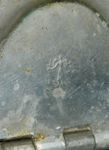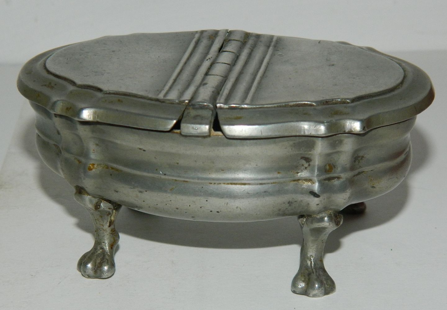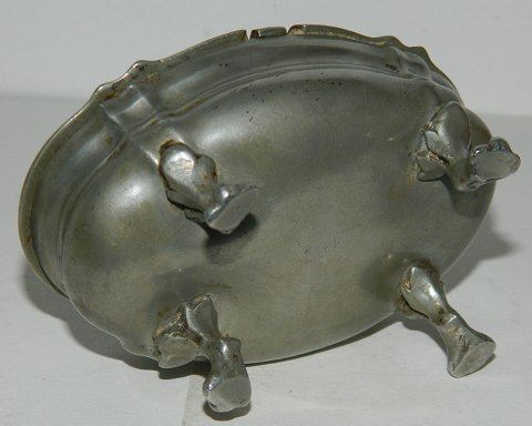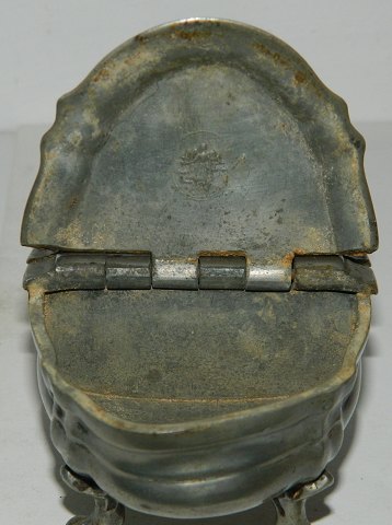 Saltkar med dobbelt låg - står på fire fødder. Fremstår i god stand uden skader eller reparationer. Mestermærket indvendigt på låget. Fremstillet omkring 1850. 4½ cm høj og 9½ lang.