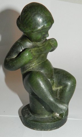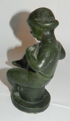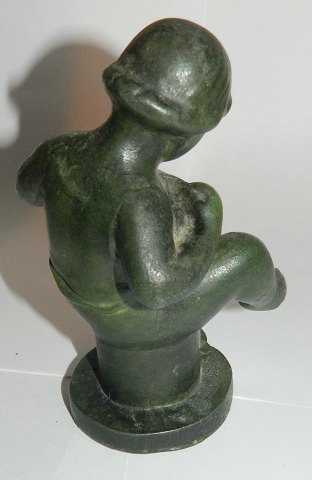 Figur i metal af nøgen dreng på skokkel. Fremstillet i 1930 erne. Overfladen grøn bronzepatinering. Fremstår i god stand uden skader eller reparationer. Ingen kunstnersignatur. 14 cm høj