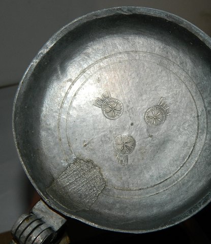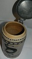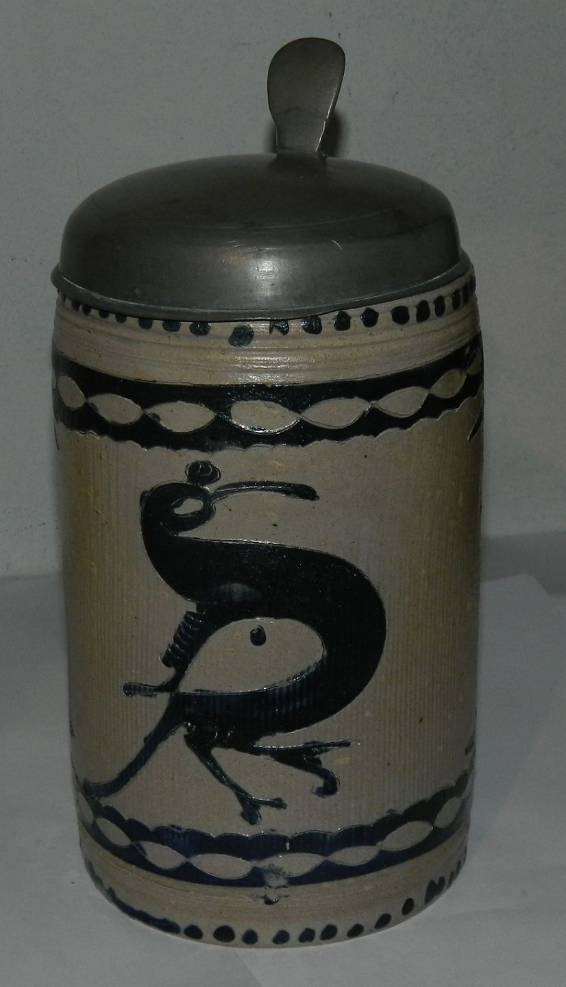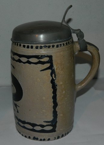 Blåt saltglaseret krus i stentøj med dekoration af fugl med låg af tin. Fremstillet i Tyskland omkring 1800. Låget er stemplet indvendigt. Ingen skader eller reparationer på kruset. 17½ cm højt - 23 cm incl. låg.