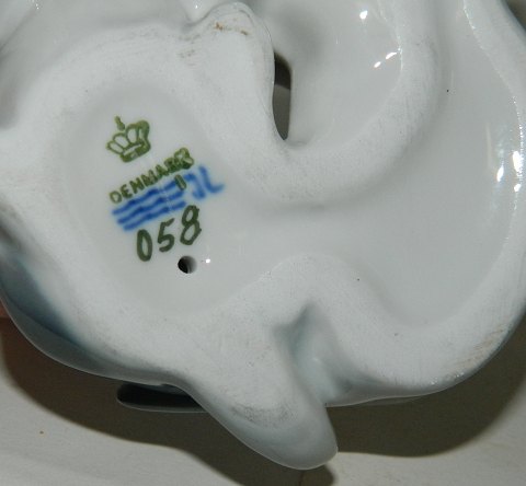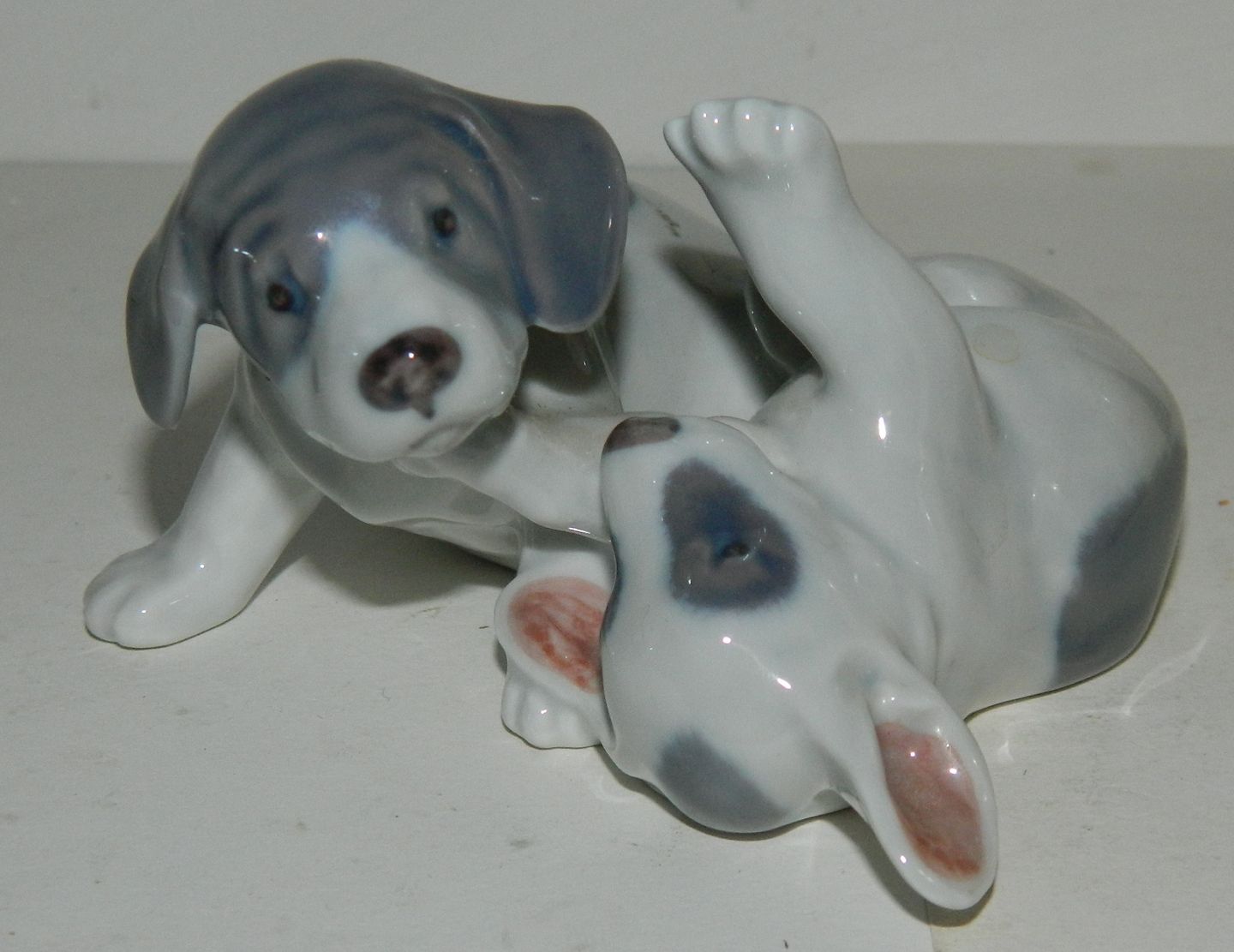 Figur i porcelæn af par legende hundehvalpe. Fremstillet hos Royal Copenhagen. Fremstår i god stand uden skader eller reparationer. 2. sortering. Modelnummer 058. Fabriksmærket på bunden. 6 cm høj.