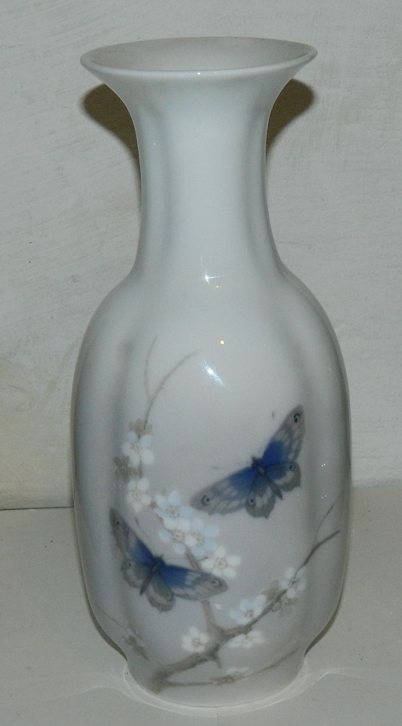Vase i porcelæn fra Royal Copenhagen. Dekoreret med blomster og sommerfugle. Fremstår i perfekt stand. Ingen skader eller reparationer. Fremstillet omkring 1930. Fabriksmærket på bunden. 26½ cm høj.
