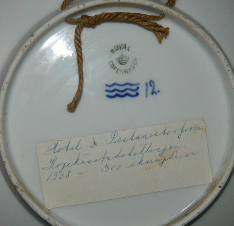 ERINDRINGSPLATTE I SKØNVIRKESTIL: Platte i porcelæn fra Royal Copenhagen. Fremstillet for Hotel- og Restaurationsforeningen i 1908. Fremstillet i 300 eksemplarer. Fremstår i perfekt stand. 1. sortering. Fabriksmærket på bagsiden. 20 cm i diameter