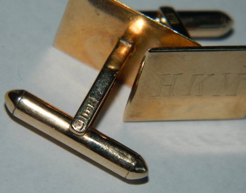 Par manchetknapper i 18K guld. Initialer indgraveret HKM på overfladen. Stemplet 18K. Mål: 1,8 cm x 1,2 cm.