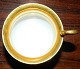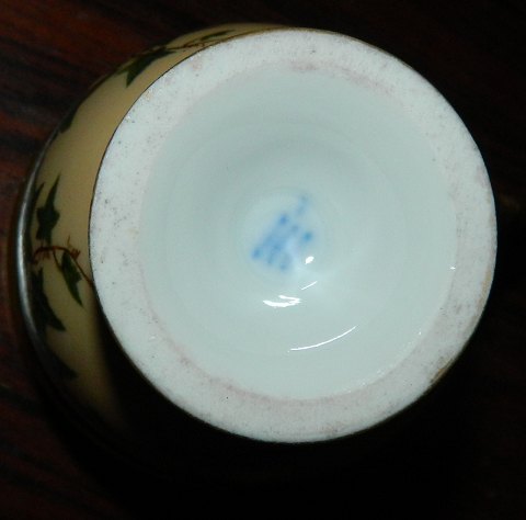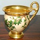 Kaffekop i porcelæn med høj hank fra Royal Copenhagen. Fremstillet omkring 1850-60. Dekoreret med bladværk. Endvidere guldbelagt indenvendigt og på hanken. Fremstår i god stand. Fabriksmærket på bunden. 10½ cm høj.