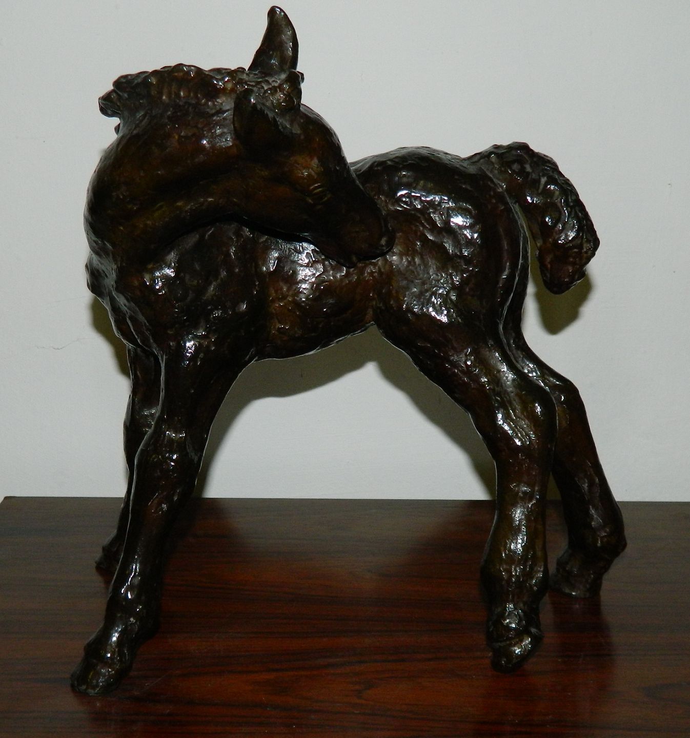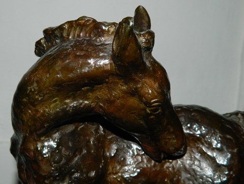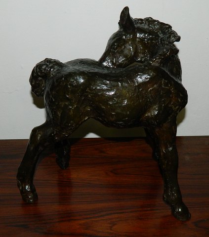 Ib Just Andersen (1884-1943) figur af bronze-patineret diskometal i form af føl. Designet af Gudrun Lauesen. Fabriksmærket under den ene hov med: Just Danmark nr. D 2333. Fremstår i perfekt stand uden skader eller reparationer. 30 cm høj. LIGNENDE KØBES