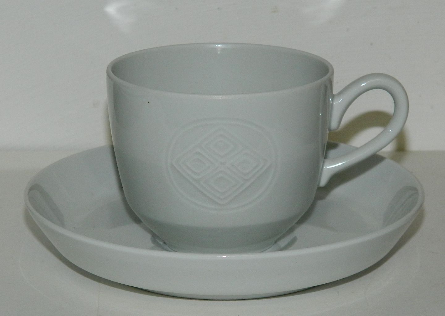 Lille kaffekop med underkop i porcelæn fra Royal Copenhagen i stellet Gemma, designet af Gertrud Vasegaard. 1. sortering. Fabriksmærket på bunden. Modelnummer 14697. Fremstår i perfekt stand. Koppen er 5½ cm høj. Flere haves.