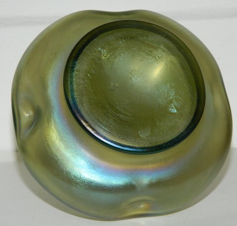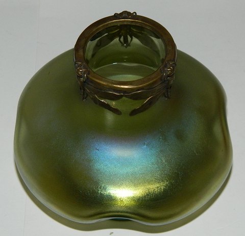Glasvase i Art Nouveau stil: Grøn glasvase i organisk form fra Loetz i Bøhmen fra ca. 1900. Dekoreret med gulssmede i metal rundt om vasens åbning. Både glas og metal i perfekt stand. Vasen er 10 cm høj