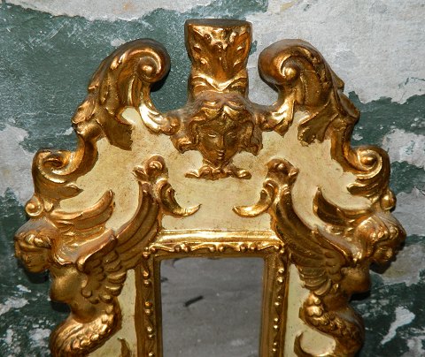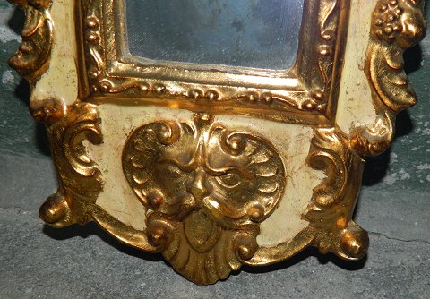 Spejl med ramme af udskåret træ. Bemalet og guldbelagt. Fremstår i god stand. 20. århundrede. 58½ højt