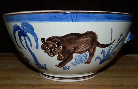 Stor skål af Odette Syberg (1907-1993) fra ca. 1950. Dekoreret med elefant på den ene side og en tiger på den anden side. Skålen har flere glasurafslag. Fremstår uden skader eller reparationer. Fabriksmærket med det velkendte Syberg logo samt kunstnersignatur O.S. på bunden. Skålen er 15½ cm høj og 30 cm i åbningsdiameter.