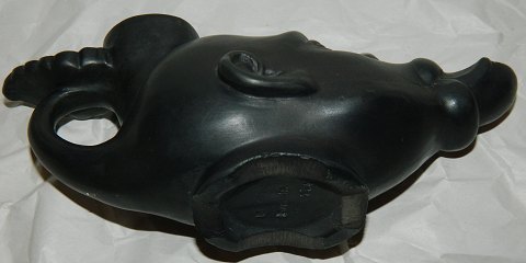 Afrikansk mandehoved i keramik som olielampe. På højre side mindre revne (produktionsfejl) ellers i god stand uden skader eller reparationer. Fremstillet i begyndelsen af 20. århundrede hos Lauritz Hjorth, Bornholm. Fabriksmærket på bunden: L. HJORTH BORNHOLM modelnr. 754. Olielampen er 7 cm høj og 17 cm lang.