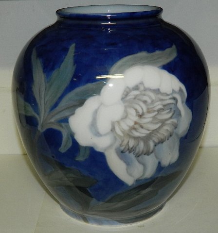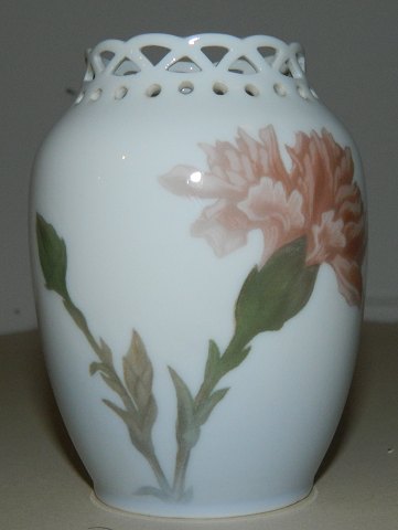 Mindre vase i porcelæn fra Royal Copenhagen. Gennembrudt dekoration på kanten af vasen. Yderligere dekoreret med håndmalet blomst. Fabriksmærket på bunden. 1. sortering. 9½ cm høj