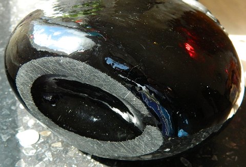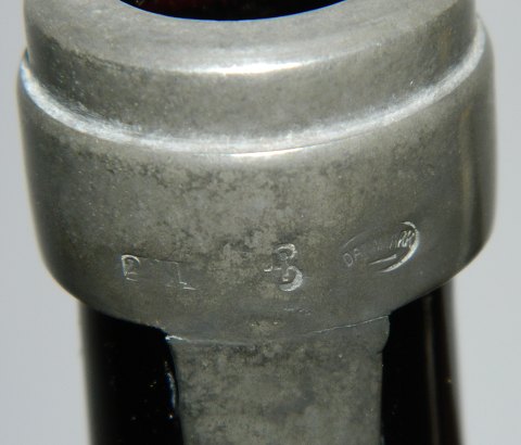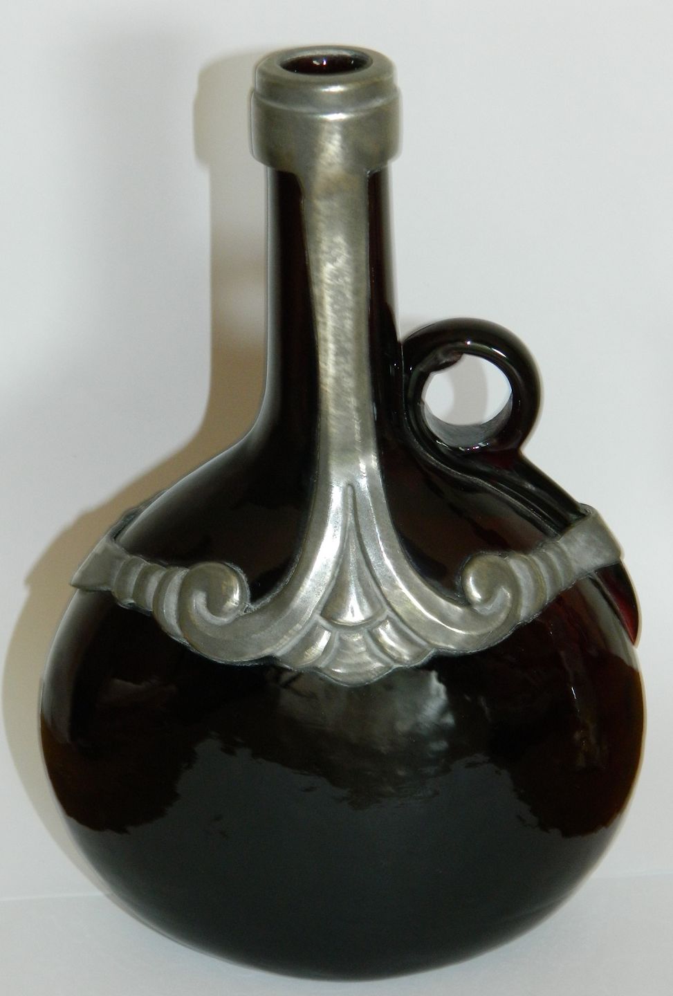 Tinmontering fra Hertz/Ballin (Peter Hertz / Mogens Ballin) på rød glasflaske fra 1920´erne. Evt. prop mangler. Flasken er 23 cm høj
