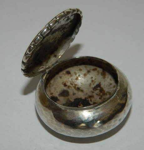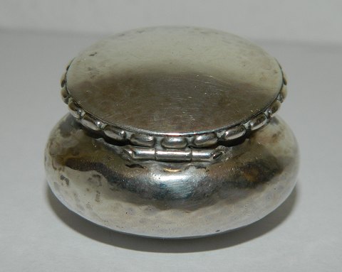 Georg Jensen pilleæske i sterling sølv. Fremstillet mellem 1909-14. I god stand uden skader eller reparationer. Ingen buler. Trænger til at blive pudset indvendigt. 2 cm høj og 4 cm in diameter.