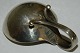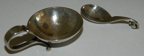 Lille saltkar i sølv fra Georg Jensen med tilhørende ske. Fremstillet mellem 1930-45. Fremstår i god stand. 2 cm høj og 4½ cm lang. Skeen er 4 cm lang. Modelnummer 110. Svenske importstempler.
