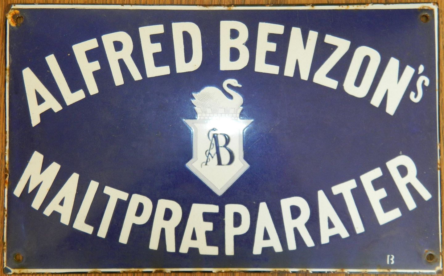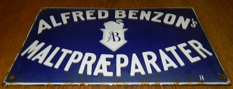 Skilt i metal med dekoration og tekst i emalje fra Alfred Benzon ca. 1940. Fremstår i god stand uden skader. Har dog aldersrelaterede skavanker med lidt rust i kanten. Ingen afslag, buler eller reparationer. Mål: 19½ cm x 31½ cm.