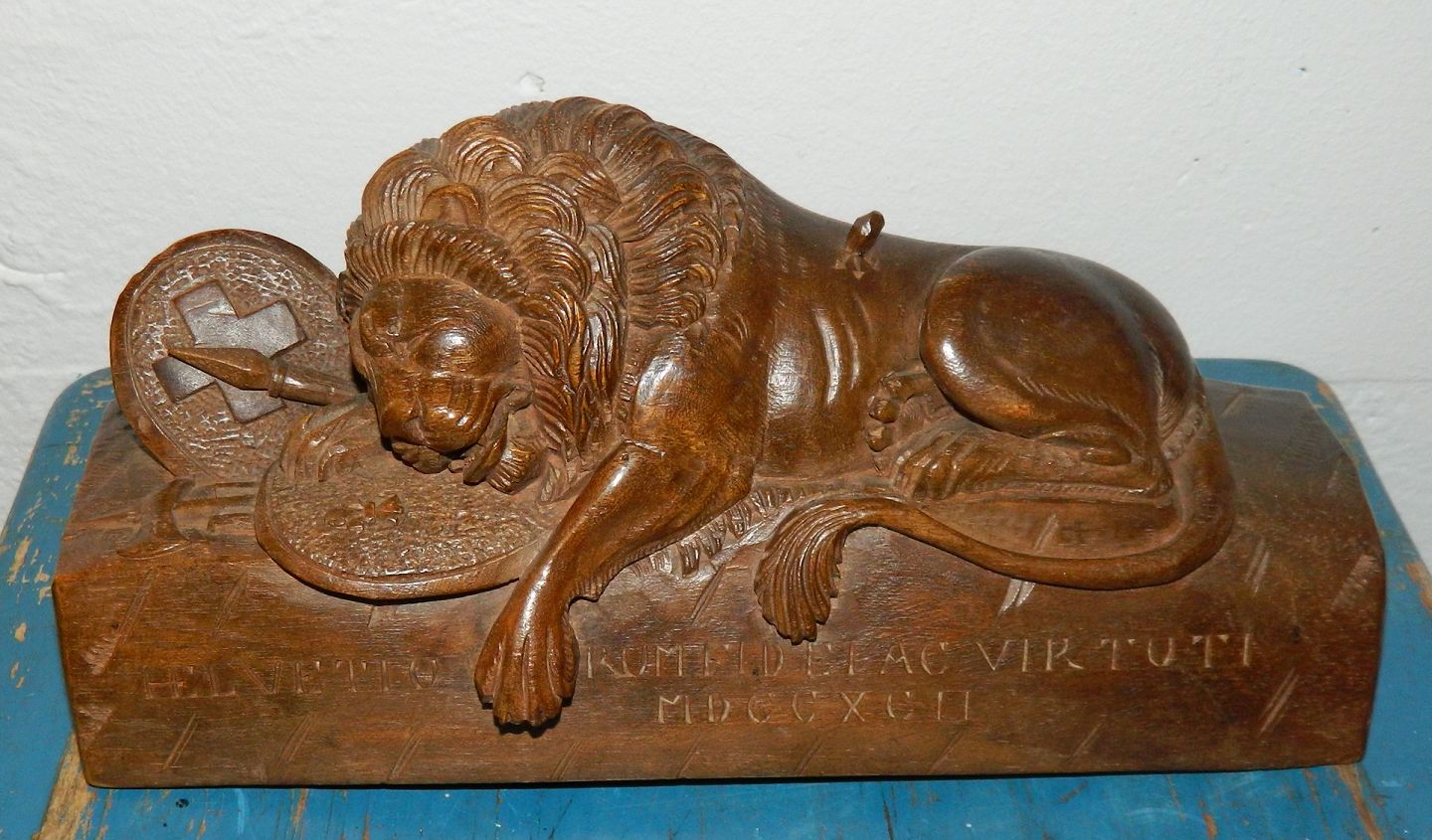 Figur af Bertel Thorvaldsen´s "Switzerløve" skåret i træ. Fremstillet omkring 1900. Fremstår i god stand uden skader eller reparationer. Figuren er 11 cm høj, 25½ cm lang og 9½ cm bred.