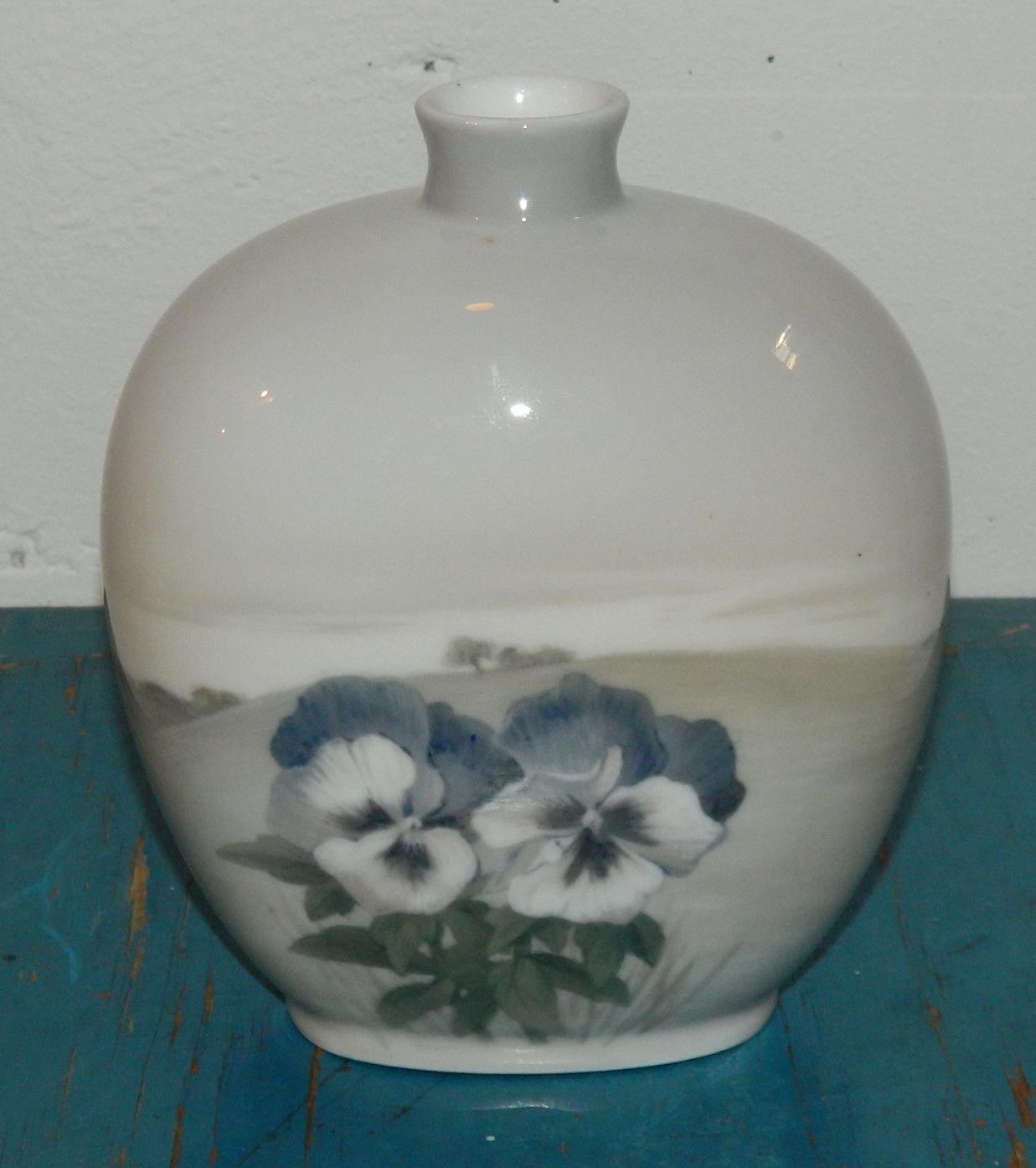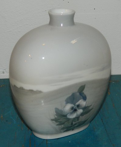 Vase i Skønvirkestil: Vase i porcelæn fra Royal Copenhagen. Fremstillet mellem 1900-1923. Dekoreret med landskabshorisont samt blomster i forgrunden. Fremstår i god stand uden skader eller reparationer. 2. sortering. Fabriksmærket på bunden. 17 cm høj.