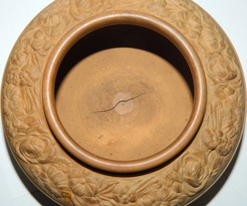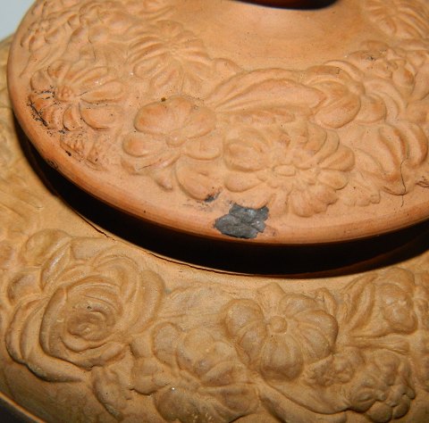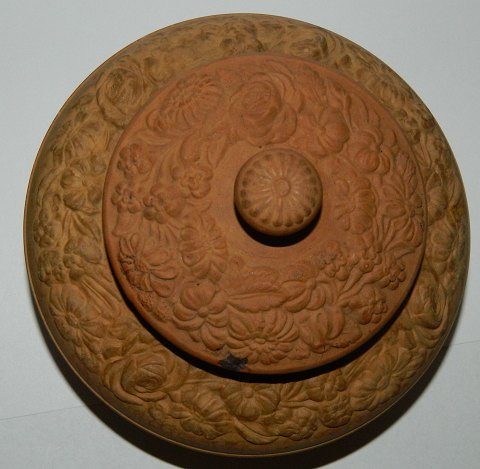 Lågskål i terracotta fra P. Ipsen ca. 1875. Har mindre skår på kanten af låget samt gennemgående fabriksrevne i bunden af skålen. Ellers ingen skader. Har muligvis været sortbemalet. Fabriksmærket på bunden. 8½ cm høj og 13½ cm i diameter.