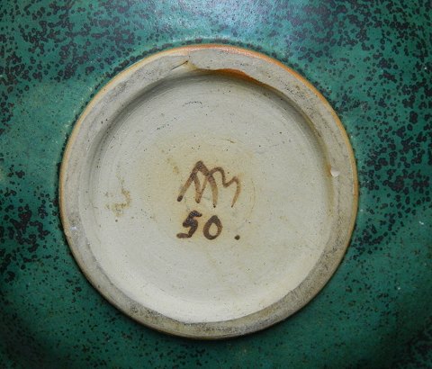 Fad i stentøj fra Arne Bang. Fremstillet omkring 1940. Fremstår i god stand uden skader eller reparationer. På for -og bagside dækket af en grøn spættet glasur. Fabriksmærket på bagsiden med AB samt modelnummer. Mål: 5½ cm høj og 28 cm i diameter.